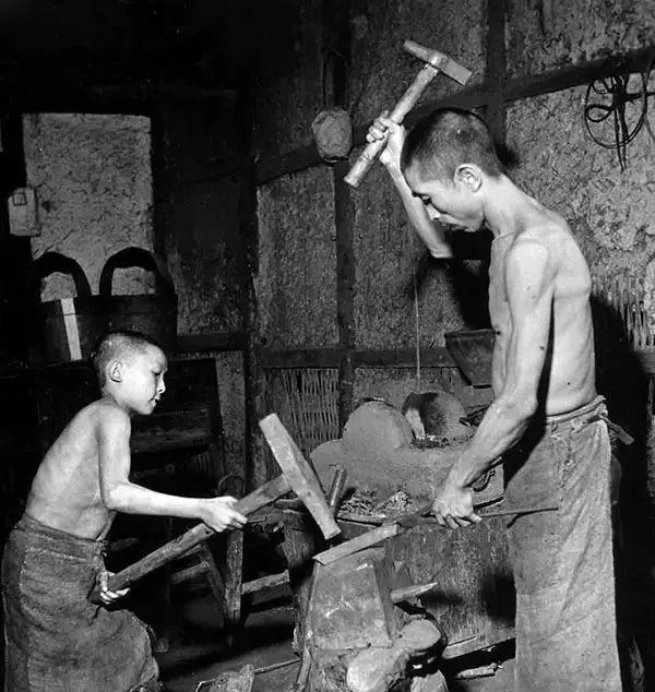 这张最让我心里一紧。父亲抡锤,孩子也赤着上身跟着打。孩子年纪不大,动作却已经很熟练。旧社会的孩子懂事早,不是嘴上说说,是真的早早就进了活路里。炉火、铁砧、汗水,照片虽然是静的,可你几乎能听到“叮叮当当”的声响。