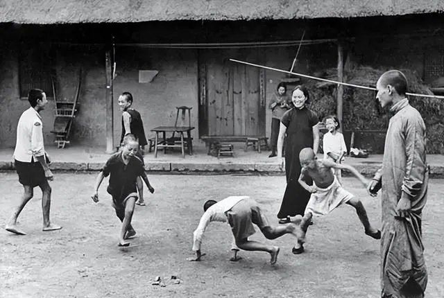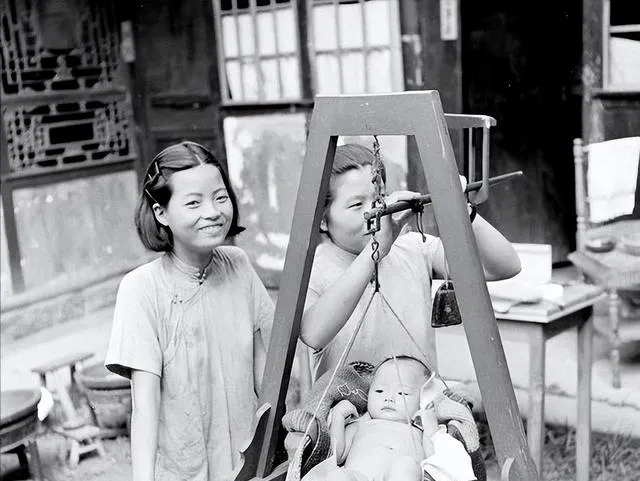 这张很温柔。孩子被放在吊秤里,大人围在旁边,一个年轻女子对着镜头笑,笑得很自然。生活再忙,家里添了小孩,照样是头等大事。老照片最动人的地方,就在这儿:它不专门拍“大事”,拍的都是过日子。