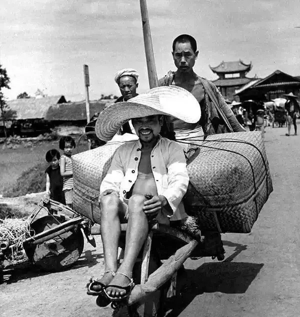 最后这张,停在路边的鸡公车特别有意思。坐着的人戴着大草帽,神情还挺轻松,后面的人推着车往前走。它不是什么高级交通工具,却是那个年代最实用的“脚力”之一。能拉人,也能拉货,乡下城边到处都见得到。