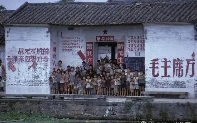 这个白墙黑瓦的屋子,门口聚着一群小孩,字都写在墙上,大红标语一排排,什么“听毛主席话”“战无不胜”,每一种字体都是刷子蘸着红漆写的,爷爷以前说那会儿谁都会写点标语,家里最小的娃都能跟着念两句,照片里人齐刷刷地站台阶上,东张西望的,刚下课还是刚干完活,脸上土一点,衣服洗得发灰,有个小孩还光着脚,小伙伴们那时没什么娱乐,跟着大人干活,唱歌、写字,一样都不会落下,你看那双眼睛里的认真劲儿,现在学校门口也有字,不过全是印刷体和电子屏,味道就变了。