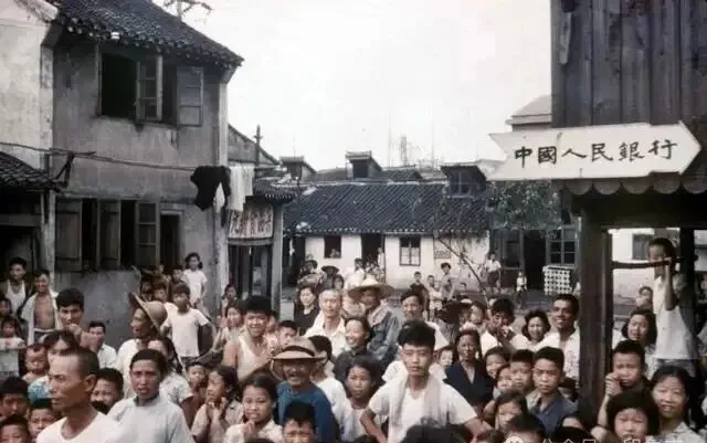 图中这帮人一溜堆,站满了巷子,谁家有新鲜事了,街坊邻居立马都聚上来看稀罕,有的小孩好奇得探头探脑,大人带着斗笠站一块儿,前排的阿姨还特意穿了件干净衣裳,旁边写着“中国人民银行”的标牌,看着有点新鲜,那会儿路边小铺,挂块木头招牌就开张,遇到个照相的,逛街的人都得停一停,现在出门谁还围着银行看热闹,网络支付都流行开了,老日子就是热闹劲儿多。