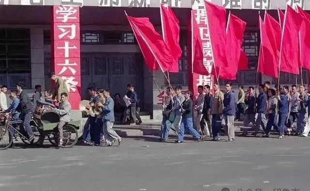 这个场面气势可不一般,十几面大红旗排成龙一样,走在街面上,旗帜干干净净,后头跟着一群男男女女,都是西装布衣,脸上认真劲儿,骑车的摊贩和跟着看的人,一个比一个多,小时候家里碰上这样的队伍,都会远远地停住脚,看一会再绕道回家,哪像现在,街头游行都很少见,大家走路脚下带风,红布条子随风飘,队伍后面总有人跟着喊口号。