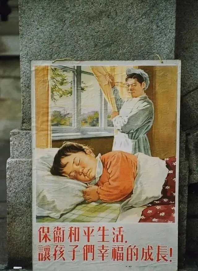 这个靠在石阶上的大宣传画,有味道,画上抱着孩子睡觉的女护工,脸上一副温柔劲儿,窗户开着阳光撒进来,下面一排“保障和平生活,让孩子们幸福的成长”几个大红字,小时候在医院或镇上办公楼门口经常能看见这类画,颜色总是鲜亮,内容一眼能懂,比现在墙上的广告招贴温柔多了,有的宣传册还夹在母亲针线篓子底下,边角磨破了还舍不得扔。