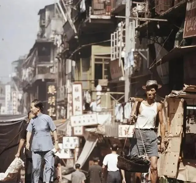 这张街景里,男人挑着扁担,肩筋鼓鼓的,手里吊着篮子,身子骨挺直,身后的女人穿着蓝旗袍,巷子两边小店铺挤挤挨挨,牌匾杂乱地堆满了临街窗台,看得人都有点费眼,这可不是影楼拍的,就是当时最实在的生活日常,天热时男人赤膊走在街头,两边叫卖声一波一波,谁家开张都得在门口贴上红纸条,街坊都会过来捧场,跟现在冷冷清清的商场,气息全不一样。