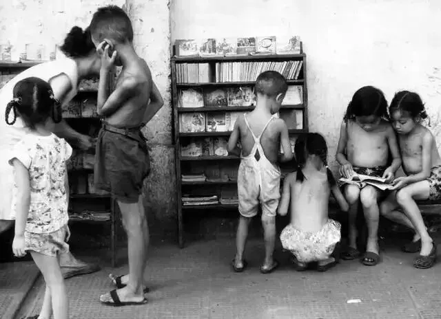 小人书摊前的几个穿背心光着膀子的孩子,形象太熟了,木书架上堆满了连环画,谁爱什么题材全凭自己挑,两个女孩坐在地上认真看,汗涔涔的脸上满是兴奋,家里穷买不起书,蹲在摊前能看一天,老板只管在一边扇扇子,没人催促,这种看书的滋味现在早没了,电子屏再亮也没那股味儿,小伙伴们围在摊前头碰头都能看一会。