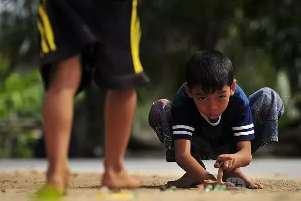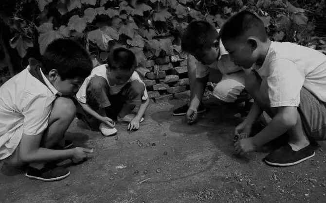 弹珠是男孩子们的心爱之物,五颜六色的弹珠,看上去就是一件美轮美奂的艺术品。男生大多热衷这类纯技术性的游戏,在玩时还互相攀比谁的弹珠多。