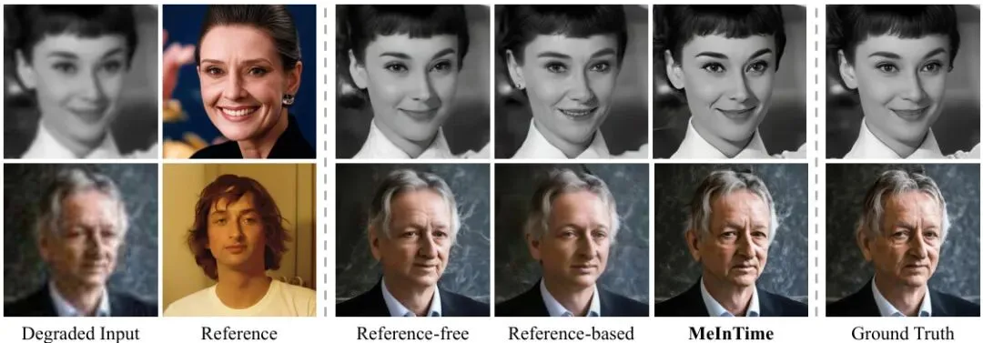 这篇论文解决的核心问题是什么?它解决的是“跨年龄人脸修复”的难题。即,当你想修复一张某人年轻时的模糊照片,但手头只有他/她现在的清晰照片作为参考时,现有方法要么认不出人(无参考方法),要么会把年轻的脸“老化”成现在的样子(传统基于参考的方法)。MeInTime的目标是,修复出身份正确、且年龄与模糊原图一致的清晰人脸。