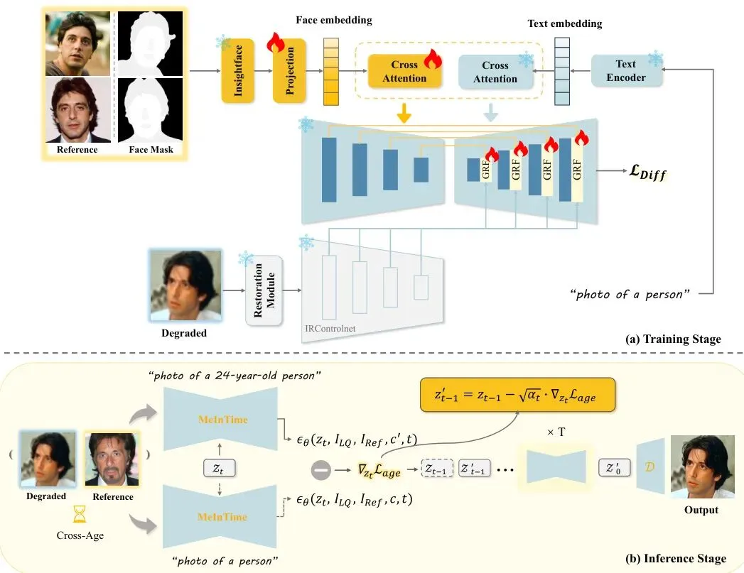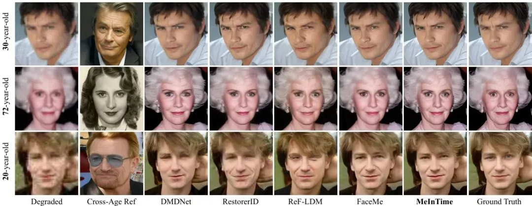 一类方法,我们称之为无参考修复 (Reference-free BFR)。它只盯着那张模糊的旧照自己琢磨,由于信息丢失太严重,它很可能“自由发挥”,修复出来的脸虽然清晰,但怎么看都不是你记忆中的那个人。身份丢了。另一类更先进的方法,叫基于参考的修复 (Reference-based Restoration)。它聪明地利用了那张清晰的现在照片作为“参考”,试图把身份特征找回来。但问题来了:当它努力从“现在的脸”提取身份信息时,很容易把“现在的年龄感”也一股脑儿复制过去。于是,你可能会得到一张有着父母年轻五官、却带着中年皱纹的“怪脸”。年龄错了。这个困境就是“年龄鸿沟”。现有的方法都暗戳戳地假设参考图和待修复图年龄相仿,一旦年龄差了几十岁,立马抓瞎。这对于历史照片修复、长期个人档案管理乃至一些刑侦场景,都是个大麻烦。图1:给定退化输入和跨年龄参考图,无参考方法无法保持身份,基于参考的方法则容易过度拟合参考特征,导致明显的年龄漂移。相比之下,MeInTime实现了身份忠实且年龄一致的修复。来自北京邮电大学、清华大学、中央民族大学和小米公司的研究团队,在论文《MEINTIME: BRIDGING AGE GAP IN IDENTITY-PRESERVING FACE RESTORATION》中,提出了一个巧妙的解决方案——MeInTime。它的核心思想只有两个字:解耦。把身份信息和年龄信息分开处理,让AI既能认对人,又能“回到”正确的年纪。解耦是关键:分而治之的身份与年龄控制