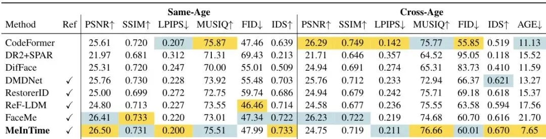 论文在同年龄和跨年龄两种场景下,与众多前沿方法进行了全面对比,包括CodeFormer、DifFace等无参考方法,以及DMDNet、RestorerID、FaceMe等基于参考的方法。表1:在同年龄和跨年龄人脸修复任务上与SOTA方法的定量对比。最佳结果标黄,次佳标蓝。同年龄修复:MeInTime在PSNR、LPIPS和身份相似度(IDS)上取得最佳,在其他指标上名列前茅,证明了其强大的身份保持和基础修复能力。