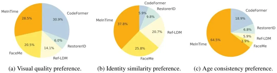 视觉对比更是一目了然。在跨年龄场景下,其他基于参考的方法都出现了明显的“年龄漂移”,把年轻的脸修老了。而MeInTime精准地定格在了正确的年纪。为了获得更贴近人类感知的评价,论文还进行了大规模用户调研。结果非常具有说服力:在年龄一致性这个核心维度上,MeInTime获得了64.5%的投票,比第二名高出45个百分点,呈现出压倒性优势。同时,它在身份相似度上也排名第一。这说明MeInTime不仅指标好,其修复结果也最符合人类的直观判断。局限与展望:更快、更准、更鲁棒