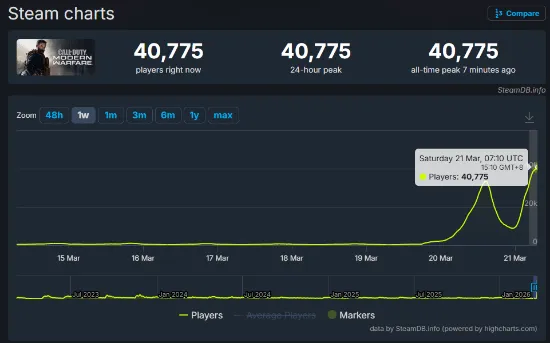 在近期的大幅促销中,经典FPS《使命召唤16:现代战争》重新迎来玩家热潮。随着游戏价格降至历史新低的39.9元(90% OFF),叠加开发组Infinity Ward开启的双倍经验周末活动,Steam在线玩家数出现爆发式增长。截至发稿,本作在Steam平台的同时在线玩家数已突破4万人,而此前其日常活跃人数仅在1000人左右波动。作为对比,动视旗下整合了《使命召唤22》与《战区》等新作的“使命召唤HQ”启动器,当前同时在线人数约为2.53万人。