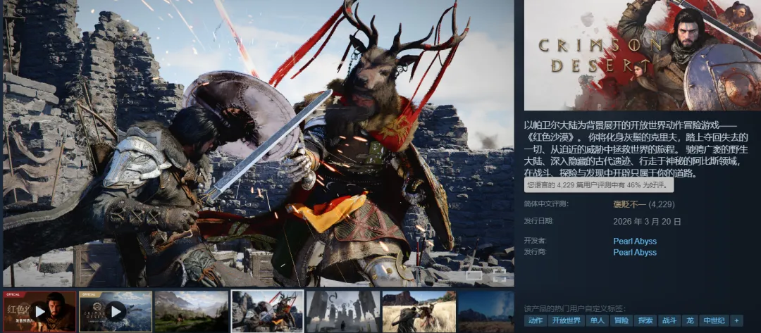 《红色沙漠》近日正式发售,这款由韩国厂商Pearl Abyss打造的开放世界动作冒险游戏在上线前就攒足了期待。不过,在正式发售后,本作在Steam上的整体评价目前仅为68%好评,褒贬不一。此外,目前国区评测好评率已跌到46%。目前国区差评大多指出以下几个痛点: