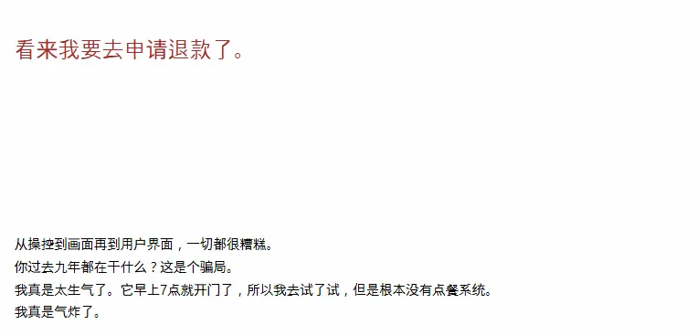 “这游戏让我都想退款了。从操作到图形界面,全都烂透了。开发这么多年都在干什么。早上7点就开始玩,还没任务引导,真是火大。”