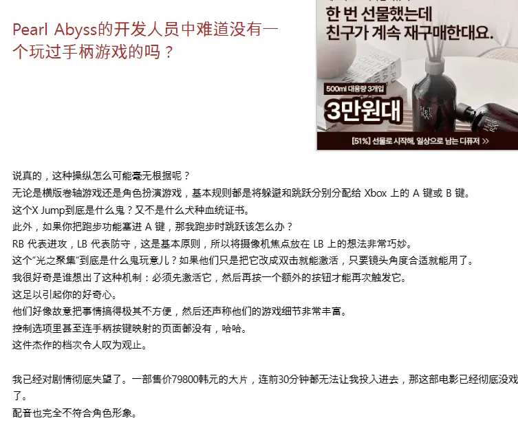 那么韩国玩家的真实看法又如何呢?在当地知名游戏社区Inven上,不少玩家也对手柄操作提出了严厉批评。有玩家直言: