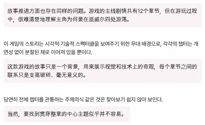 下文中记者提到了Steam上60%左右褒贬不一的评价,称本作是一款“问题重重的游戏”,本作“未能听从用户意见,因其太过注重炫耀技术力和内容量。”记者还说到,本作的剧情同样让人一头雾水,各个章节之间的联系支离破碎,毫无意义。