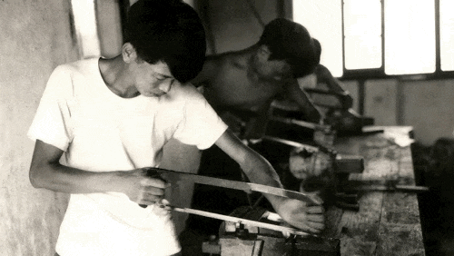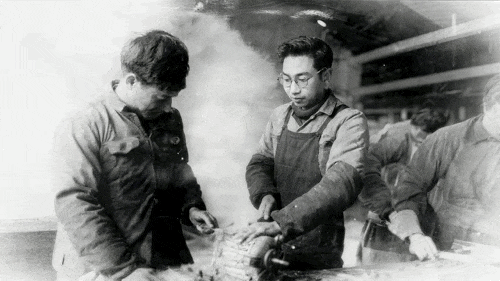 1958年,学生们截好钢条打滚珠