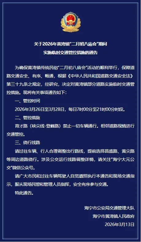 公交线路调整如下:203路、206路公交线及黄湾社区巴士5号线自2026年3月26日至3月28日,绕道管制路段,直走硖尖线,暂不停靠黄湾、黄湾中学公交站点。