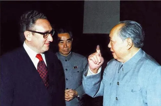 这张很多人第一眼会先看基辛格,其实我更注意毛主席抬起手指的神情。不是夸张的动作,却有一种谈话正到关键处的劲头。周总理站在后面,神色沉稳,整个画面很安静,但你能感觉到那种你来我往、句句有分量的气氛。以前总觉得这类会见照都差不多,可这张不一样,人物站位、眼神交流,都很有现场感。