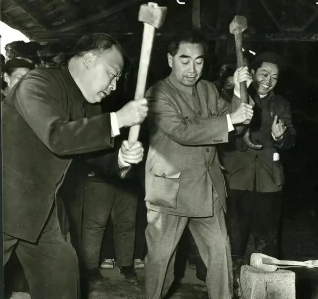 这一张真是难得。周总理和陈毅元帅一人一把铁锤,袖口利落,动作不是摆样子,是真的往下砸。旁边围观的人笑着鼓掌,火热劲儿几乎要从照片里冒出来。黑白影像本来容易显得远,可这张一点不远,你甚至能脑补出车间里的闷热、铁器的碰撞声。别看只是一个挥锤的动作,那个年代“人往前冲”的劲头,一下就看见了。