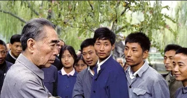 这一张特别有生活感。周总理站在人群前,年轻人穿着蓝灰色上衣,头发、神情、站姿,都带着那个年代特有的朴素劲儿。有人认真听,有人偷偷往镜头这边看,还有人神色有点拘谨。这样的照片好看就好看在,不是每个人都“准备好了”,所以特别真。你看那些年轻面孔,会不会也想起家里老相册里类似的合影?