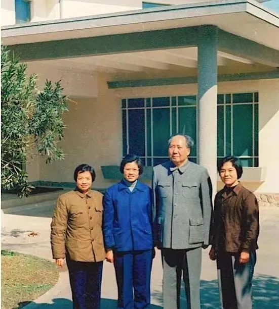 最后这张很安静。楼房线条简洁,门廊、立柱、草地,都带着六七十年代建筑特有的清爽感。毛主席站在中间,身边是工作人员,大家穿着朴素,神情自然,没有刻意排场。这样的合影现在看特别珍贵,因为它留下来的不只是人物,还有那个年代单位院落的环境、服装样式和人与人之间的距离感。