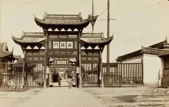 照片里这座牌楼过去叫西辕门,飞檐翘角,黑瓦红柱,门头宽得踩着泥地都带点厚重劲道,三字横匾挂在顶部,木雕花纹都有点斑驳,那年月外头没多少车辆,只有行人拉着长影子慢慢走,门前踩过的全是土路,左边角落还卧着一头老牛,眼神透着笃定,搁现在估计成了文保单位咯,可那时就是日常出门的必经处。