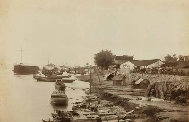 这个场景就是长江边的老码头,杂乱的木船靠着岸边紧挨着,水面宽阔,堤岸没像现在那么高大规整,就是一带土坡,几间矮棚子歪歪斜斜撑着,远处轮廓里还能看见零星几个纤夫,江风一吹,波纹慢吞吞打着涟漪,带点泥腥味。
