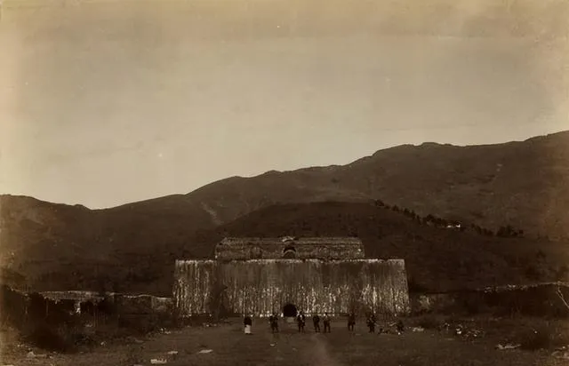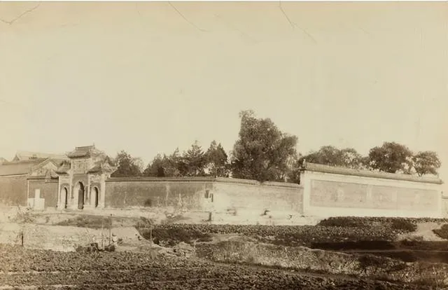 这张照片里的老房子叫明孝陵的山门,周围光秃秃,没什么树荫,只有一坡荒草,大门暗暗的,和现在参观时那种绿茵环绕完全不一样,小路上走着几个人影远远拉开,静悄悄只听得见风从山坡那边刮过。