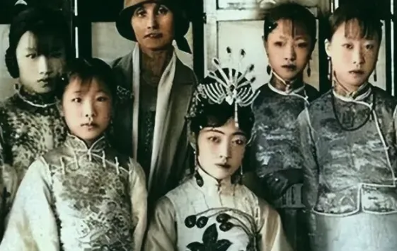 图里这几个身穿旗袍的女子,外头罩着宽大的披肩,衣角拖在地上,头饰繁琐得厉害,尤其中间那位,顶着一大簇银饰头冠,粉底打得瓷白瓷白,嘴唇像画的小樱桃,站得规规矩矩,一副参加大礼的架势,旁边几个年轻女孩衣服花色都精巧,锃亮的缎面折着细细的光,眉毛细长,没笑,眼神里透出来的,是那时候家里讲排场的讲究。