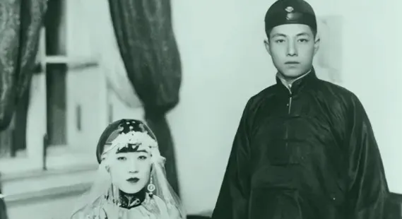 照片里这个穿长衣的瘦高少年,就是林彪十六岁时的模样,个头拔尖,五官浓眉大眼,眉宇间带点不服气的劲头,站姿笔直,袖口收得严丝合缝,旁边的女孩戴着传统的戏服头巾,瓷粉涂脸,看着有点憨,俩人站那儿都挺拘谨。