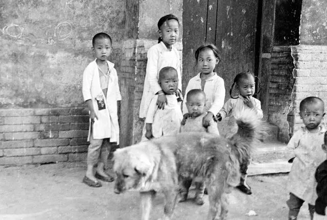图里站着一撮小孩,衣裳不讲究,梳着小辫尖儿,脚下穿着宽大的布鞋,有的光着脚趾头跑,推门狗跟在一旁,尾巴甩得自在,胡同窄得很,孩子们都能一下串门,家里大人喊一声就到跟前了,笑没笑都随孩子的心情,有的小孩腰间还挂着个小物件,看着像用来背银锁的布袋,头发理得干净,走到哪都跟着一帮小伙伴儿起哄。