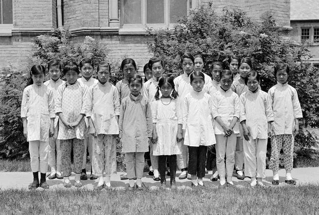 这是一群穿着整齐的女孩子,排成两行站得板直,衣服都是细棉布,裤脚收得紧,不讲花样,黑白照片拍出一种老练的素净味儿,姑娘们年纪虽小,眉眼带着认真的神情,背景的老房子是学堂无误,那时候能来女学堂念书的家庭一般都开明,有的姑娘书包自己缝,有的走南闯北才进得成这道门。