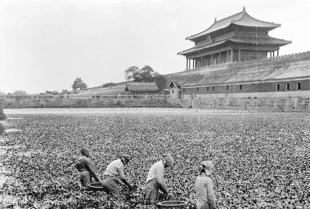 图里几个人埋头在荷叶塘里,腰身弯得低,一手扯着竹筐,一手拨拉水草,背景是当年的紫禁城墙砖,气势在那杵着,地上的人却忙得很,汗水和泥浆搅一起,季节一满整池的荷叶收下来能搭粽叶,也能拌菜,城墙里富贵,城墙外苦力,谁也没闲着。