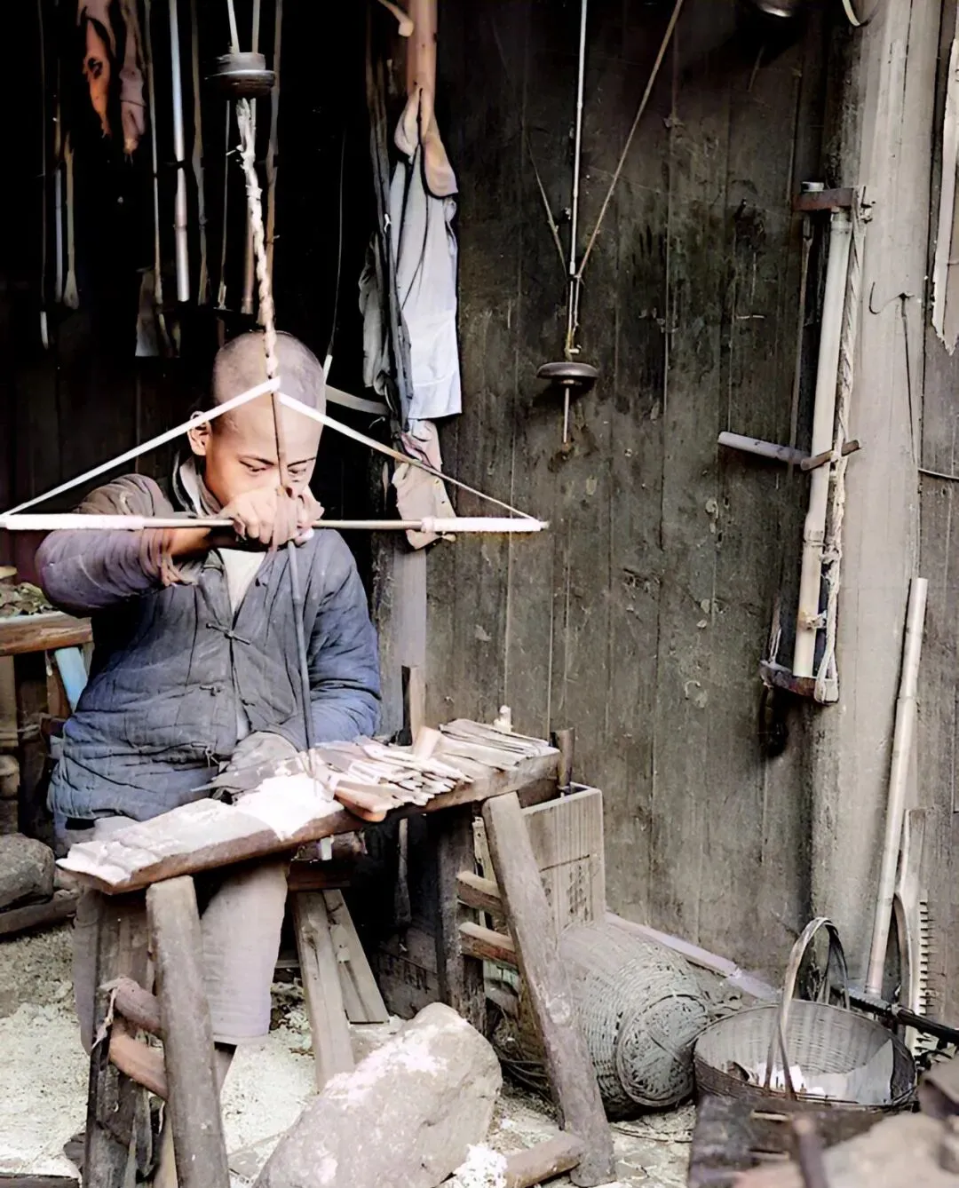 照片里小伙子坐着,用传统木钻在木板上钻孔,钻帽上下拉扯着,木头上出一排排圆洞,墙上挂着各样家什,气味里混着木屑味,这种钻法现在少见了,家里有人会木工的,手心总是硬邦邦一层茧,冬天干裂开花,年轻人现在见着也只当新鲜玩意看。