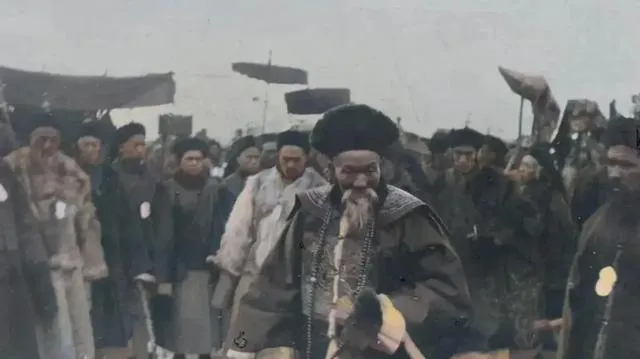 第一张就很有压迫感。走在最前面的那位官员,胡子长,帽子大,神情也稳,身后跟着一群随从,场面一下就撑起来了。可真正让我注意的,不是“官威”,而是周围人的站位和衣服。大家都裹得厚,颜色灰扑扑的,风一吹似的,整张照片都有股寒气。以前总觉得清朝官员离普通人很远,可你细看,又会发现他们其实也活在这种土路、冷天、人群围看的真实环境里。