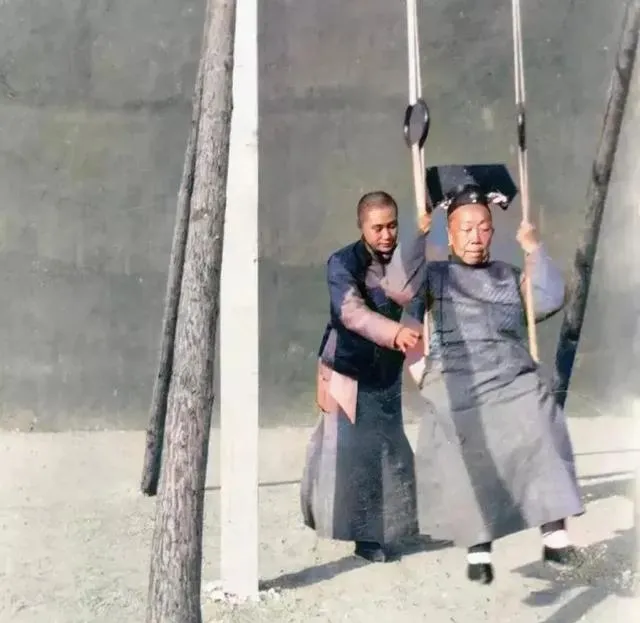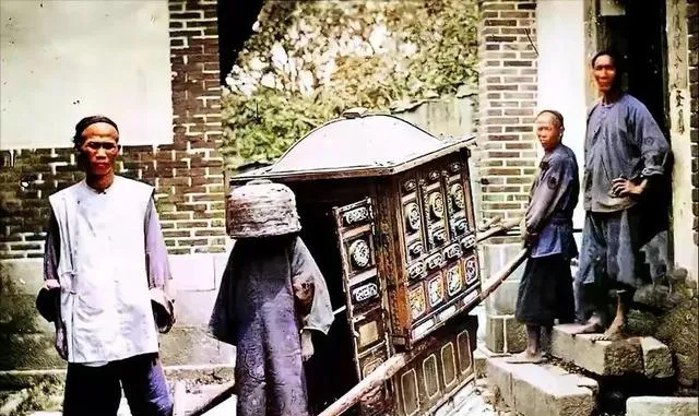 这顶轿子做得真精致,木雕、花纹、边角都不含糊。可抬轿的人站在旁边,衣着普通,脚下还是土路和石阶,一下又把人拉回现实。旧社会的等级感,往往就体现在这种对比里:有人坐轿,有人抬轿;有人讲排场,有人出力气。照片不说教,但看一眼就明白。