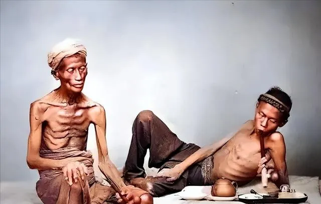 这一张说实话,看着有点难受。两个人瘦得只剩骨架,坐在那里,眼神空空的。桌上的烟具摆得很清楚,旁边那只手还搭着,像是习惯了。照片不会说话,但身体就是最直接的证词。很多人一说晚清,就想到朝堂、战争、条约,可普通人的衰败,其实更扎眼。不是一句“苦”就能概括的,是那种脸上没光、身上没肉、连坐姿都松掉了的无力。