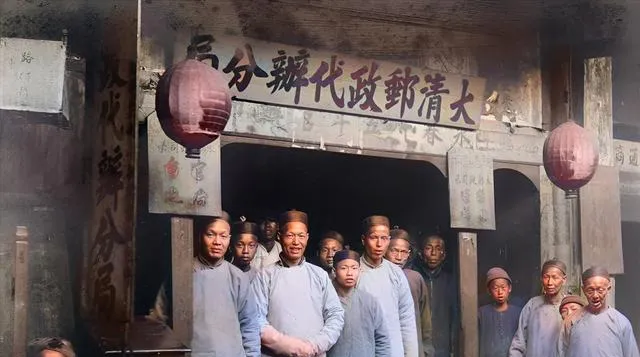 这张我挺喜欢看。门口挂着灯笼,牌匾写着“大清邮政代办分局”,一群人站在门口,像是听说要拍照,都尽量往前凑。别看只是一个小门脸,信息量真不小。说明那时候一些地方已经有了很近代的通信体系,老城、木柱、手写招牌,和“邮政”这两个字放在一起,有种新旧并排站着的感觉。要是不说年份,你会不会以为已经到民国了?