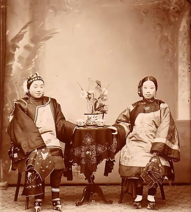 这张老照片特别耐看。两个女子坐在椅子上,中间摆着小桌,桌布、花瓶、茶具都很讲究。右边那位多半就是新娘,脸上没有笑,坐得端端正正,手轻轻搭着。你说她是羞,还是紧张?都像。那个年代的婚嫁,很多情绪是不能说出口的,只能藏在眼神和姿势里。最妙的是脚边那点细节,鞋子、小腿、衣摆,一下就把“旧式婚礼”的气氛拎出来了。