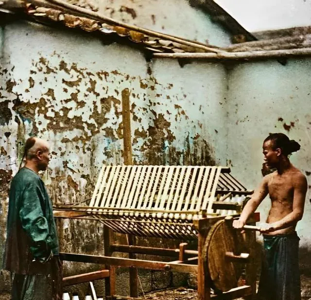 一个光着膀子的男人站在机器边,手握摇柄,旁边的人看着。院墙斑驳,木架粗糙,地上也不讲究,可这一套东西就是一家人的生计。现在看这种纺纱机,会觉得笨重、费力,可在那个时候,能靠手转起来,就是实打实的饭碗。照片里最打动我的,是那男人瘦归瘦,胳膊却有劲,像是天天这么摇出来的。