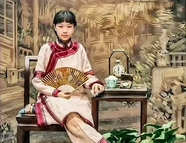这一张像今天影楼会模仿的复古照。少女手里拿着折扇,旁边摆着钟表和茶杯,背景刷得有点梦幻。可真看细了,神情还是老照片的味道——不松弛,也不刻意笑。她坐得很正,腿并拢,眼神直直看镜头。那个年代拍照不是件轻松事,所以很多人的表情都带一点认真。这种认真,反而比笑更有记忆点。
