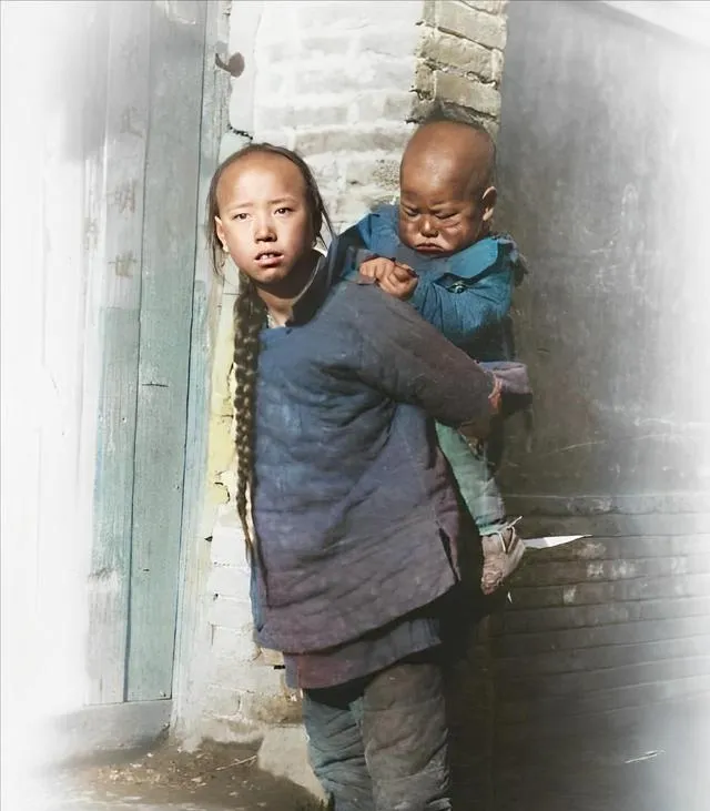 这张最有生活味。一个小女孩背着弟弟,站在门边回头看,辫子又长又粗,衣服旧,但洗得还算干净。背上的弟弟肉乎乎地趴着,眼睛都快睁不开。别看只是门口一站,家里的日子就出来了:大人忙,小孩带小孩,院子不大,墙砖有旧痕。这种画面,很多上了年纪的人一看就懂。