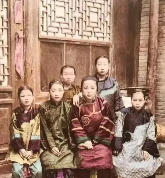 几位女孩围坐在门前,衣服颜色倒不少,有深红、有墨绿、有浅蓝。第一眼会觉得她们挺体面,可再看坐姿和神态,又不是那种轻松的少女气,而是有点拘着。她们的头发、衣襟、袖口都收拾得很细,说明拍照前是认真准备过的。旧时代的姑娘,很多时候就是这样,被要求坐得端、穿得齐,连表情都不能太随便。