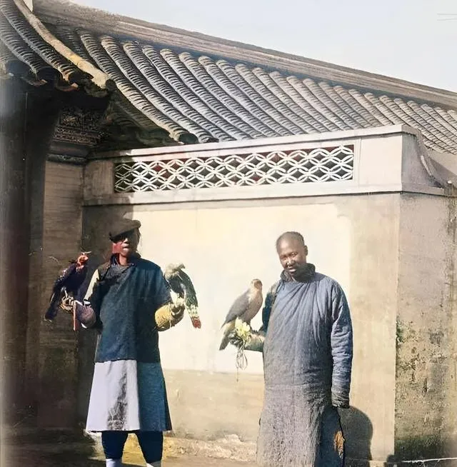 这张看着有点复杂。两个男人站在墙前,手上架着鹰,神态都挺平静。院墙高,屋檐整齐,环境显然不是普通寒家。过去常说有人整天逗鹰遛鸟,听着像一句骂人话,可照片真摆在眼前,你会发现那种“闲”是很具体的:穿着长袍,站在太阳底下,手臂稳稳托着鹰,时间好像也慢下来了。