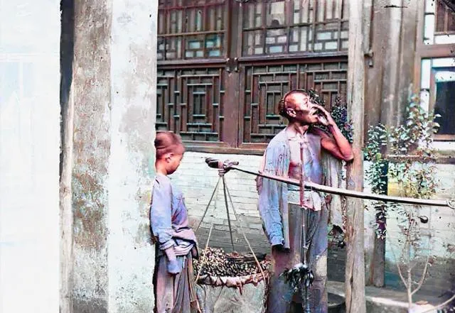 一个男人挑着担子,旁边站着个孩子。他自己低头抽着烟,像是歇口气,也像在等人来买。担子里装的是什么,不一定看得清,可那根扁担一压肩,生活的分量就有了。以前的买卖,不是店里等客,是真靠一双腿,一条巷子一条巷子喊出来的。这样的场景,你小时候见过吗?