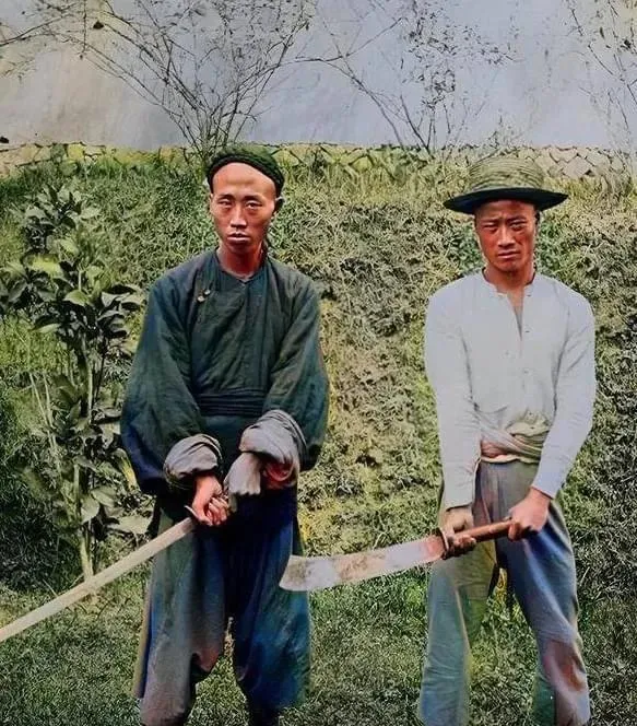这一张带着一股冷气。两个人手里提着长刀,刀身弯,亮得扎眼。奇怪的是,他们并没有做出很凶狠的表情,反而显得平常。也正因为这种平常,才更让人心里发紧。很多历史,不是写在大事件里,而是藏在这种职业照片里——看着只是两个人站着,可背后是一个时代的刑罚观念和生存方式。