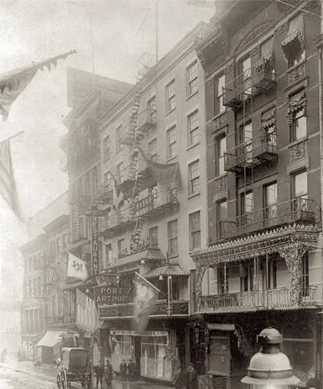 照片里这一栋,招牌挂成一串,PORT ARTHUR老餐厅算是名气响的,英文招牌粗大,楼下玻璃里还能看到小旗子、桌椅影子,头顶上防火梯弯弯曲曲,挨着几家小店,最下面那层热气腾腾的,谁家节日请客,总要拐到门前来沾点人气。