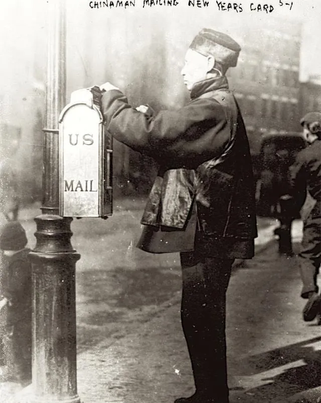 这个老哥站在街头,手里捏着一张新年卡,脸上带着认真的神情,身上穿着长衫马褂,一手把卡片投进美式邮筒,动作慢,像怕送得不稳,这一刻大概就在心里默念,千山之外还有家人在等信。