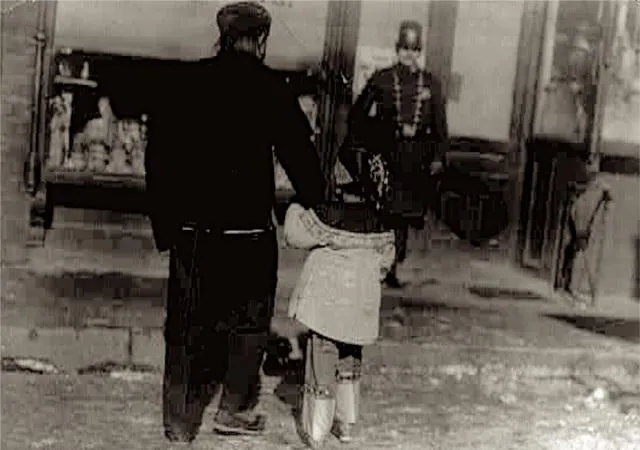 这一张要说,站在台阶上的男人,一手牵着小孩,小孩绷着圆脸,穿着裁剪整齐的棉衣马甲,两只手被大人握得紧实,街头冷风一吹,人小脚短,走路还踉跄,男人低头看着孩子,嘴里念叨“小心点啊,别摔着”,语气里藏了点不放心。