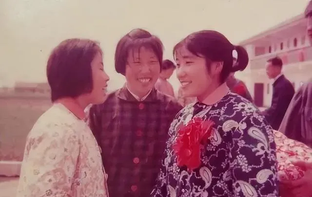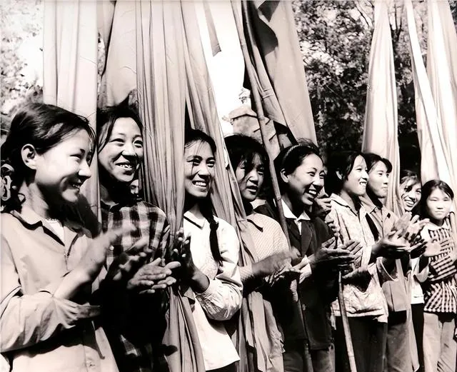 这一张看着特别热闹。姑娘们一字排开,旁边是一排旗子,像是参加集会或者活动。她们有的穿格子衬衣,有的穿浅色外套,衣服并不新,也谈不上多讲究,但你会发现,那个年代的人站在人群里,脸都很舒展。笑的时候不扭捏,鼓掌的时候也是真高兴。以前总觉得那个年代很“苦”,可这些照片里最先冒出来的,反倒是一种很明亮的集体气氛。